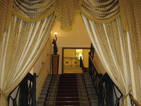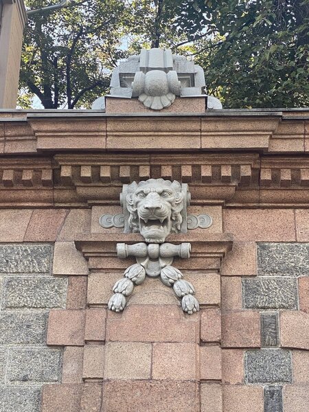Если вновь вернуться к внешним деталям, становится заметно, как архитектор работал с тяжёлой пластикой. Каменные блоки выложены так, что создают эффект «стены-крепости». В сочетании с глубокими нишами и массивными колоннами это делает фасад очень выразительным и почти оборонительным. При этом декоративные элементы, особенно львиные головы, немного оживляют этот строгость. Они смотрятся как отсылки к гербовым мотивам и символике.