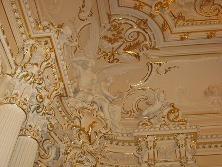 В интерьерах встречаются элементы барельефного характера это композиции с фигурами, ангелами, мифологическими персонажами. Они подчеркивают парадность дома и выводят пространство на уровень дворцовых залов. Такие решения отражают вкус заказчика, ориентированный на яркий декоративный жест.