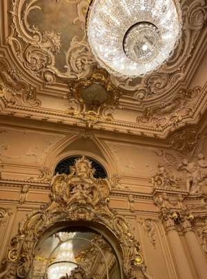Следующий зал уже относится к другой декоративной линии, где присутствуют элементы барокко и классицизма. Золочёные рамы, лепной декор, зеркала и орнаменты создают совершенно иной характер. Но такие пространства помогают понять общую структуру особняка: он не выдержан в одном стиле, а собирает несколько направлений, которые существовали параллельно.