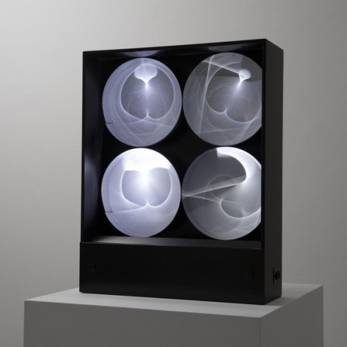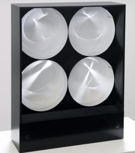 «Начиная с 1956 года он начал замысливать свои первые запрограммированные геометрические картины на основе математических принципов… в 1962 году его исследование хроматической поляризации света привело его к созданию своих первых светящихся коробок, называемых Polascopes.» [04]