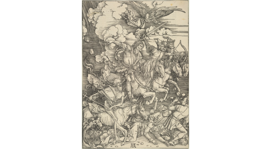 Самая известная работа из этого цикла — «Четыре Апокалиптических всадника» Лист 4 из серии «Апокалипсис» (1498 г.). В центре композиции четверо всадников, символизирующие бедствия, которые случатся во время конца света. Всадники Апокалипсиса Чума (всадник с луком) и Война (всадник с мечом) изображены в виде восточных людей, что отражает страх европейцев перед турками, захватившими Константинополь в 1453 году. Голод представлен в виде богатого европейца с весами, символизирующими ростовщичество. Смерть — худой старик на костлявой лошади.