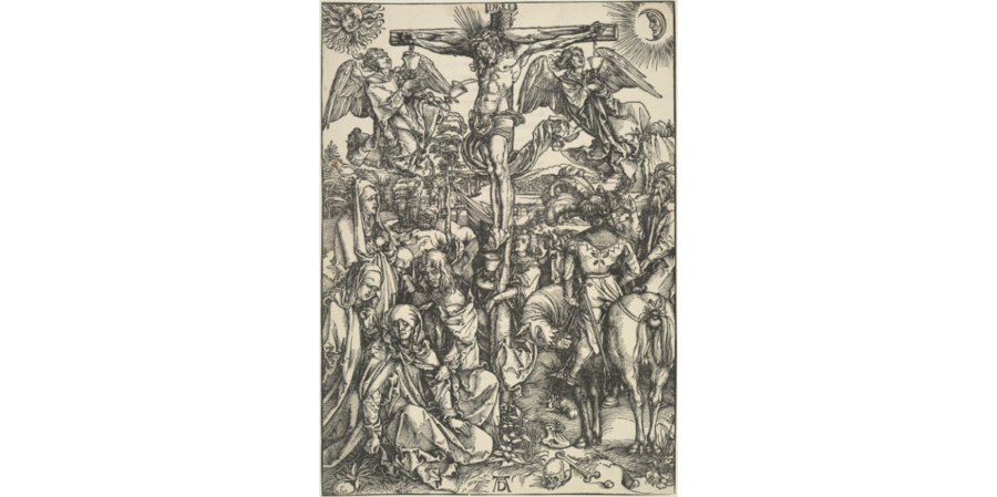 «Распятие» (Лист 7 из цикла). Сам по себе цикл построен так, чтобы набор изображений превращался в художественный текст. «Распятие» — это кульминация сюжета и смысловой центр. Дюрер больше «очеловечивает» Христа, изображая его телесно и анатомически достоверно. Страдание становится переживаемым.