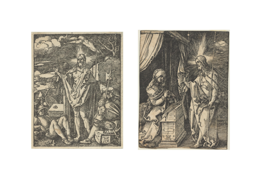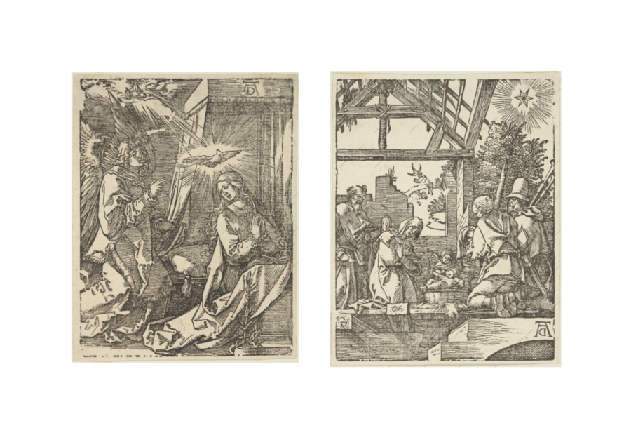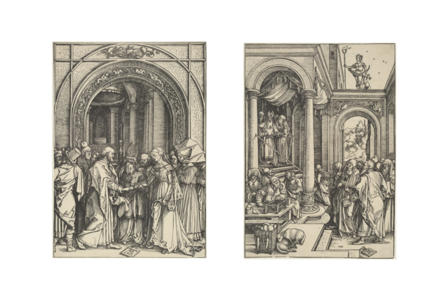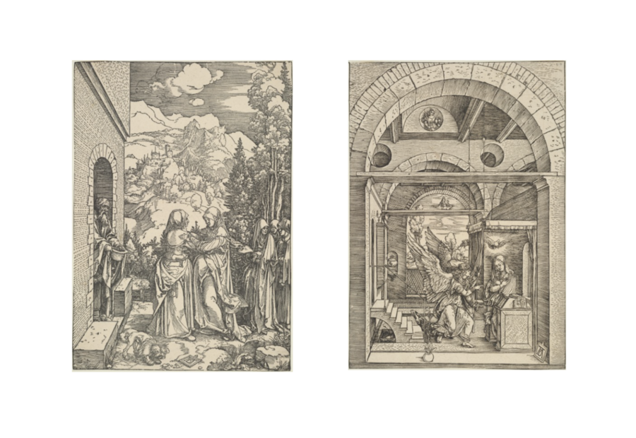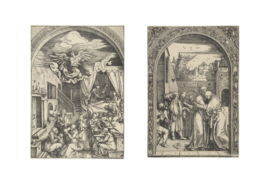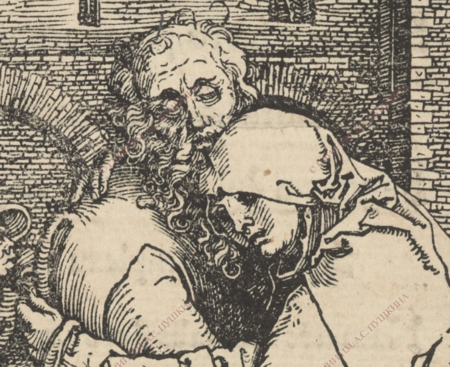 «Встреча Иоакима и Анны у Золотых ворот» (1504) Дюрер, создавая гравюру, обращается к «Протоевангелию Иакова», где описывается божественное обещание рождения Девы Марии и радостная встреча ее родителей у Золотых ворот. Эпизод, который в эпоху позднего Средневековья считался символическим началом истории спасения. Важной особенностью является встраивание божественного в человеческий контекст. Чудо проявляется здесь тихо. Символика, позы, архитектура — все это направлено на выделение божественного происхождения Богородицы.