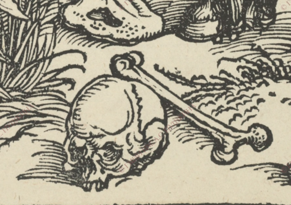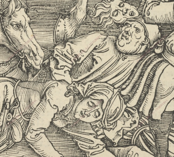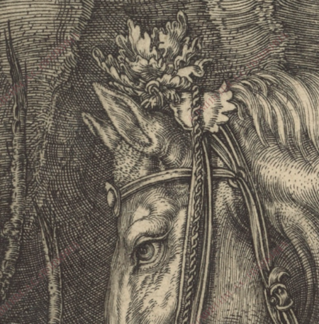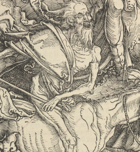 «Рыцарь, смерть и дьявол» (1513) Композиция гравюры показывает всадника, окруженного соблазнами и опасностями (по правую руку от него едет Смерть, а позади идет Дьявол). Он символизирует добродетель и стойкость, а его образ подчеркивает активную жизненную позицию и необходимость моральной стойкости перед лицом внешних угроз и внутренних испытаний. Вокруг рыцаря мы видим символы добродетелей, которые могут помочь ему в борьбе. Пес — это верность и преданность, а дубовые листья, вплетенные в гриву и хвост коня — сила духа.
