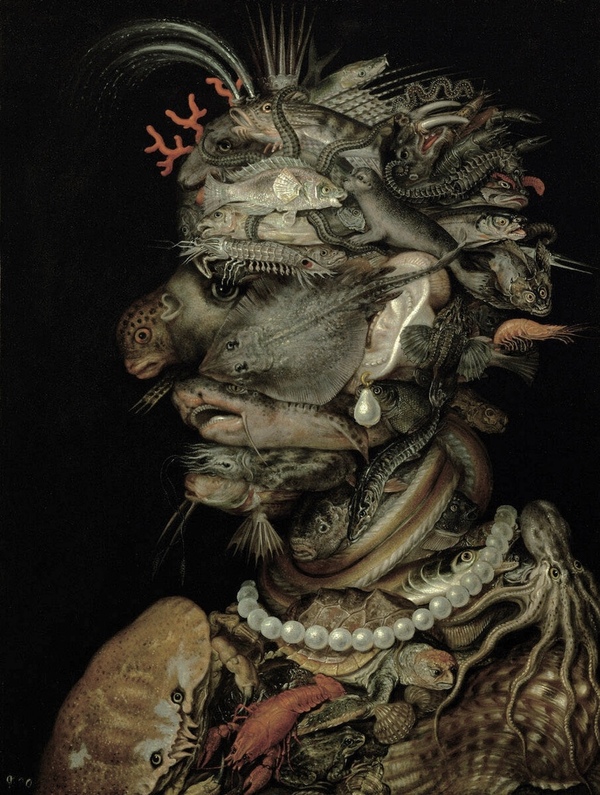 Джузеппе Арчимбольдо, слева «Вода» 1566, справа «Портрет императора Рудольфа II в образе Вертумна», 1590