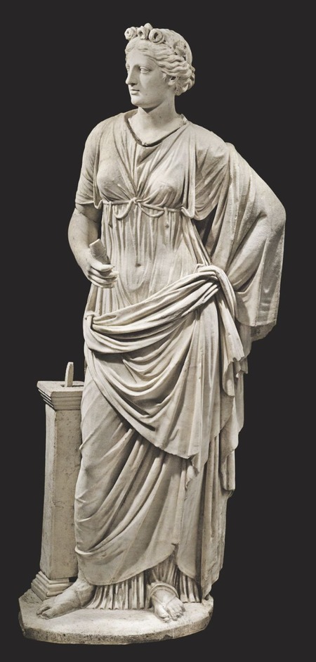 Прическа женщин состояла из волос, уложенных на затылке и удерживаемых повязкой или сеткой. Они визуально вытягивали шею, делая ее более стройной. Низко расположенные пряди у лба, который у гречанок не должен был быть выдающимся, плавно поднимались к затылочному узлу, очерчивая изящный силуэт головы. Завитки волос, перекликающиеся с линиями драпировок, но не повторяющие их в точности, создавали ощущение завершенности и гармоничного единства всего образа.