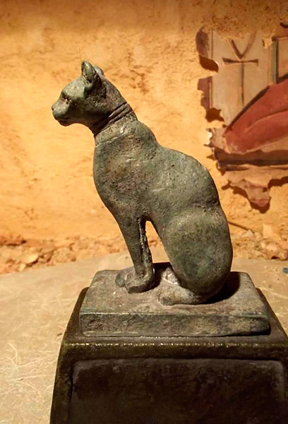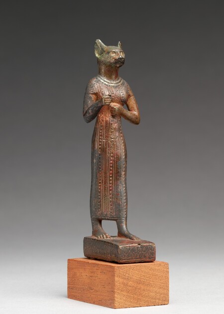Антропоморфное изображение богини Бастет, 664–630 годы до н. э., Метрополитен-музей / Бронзовая статуэтка кошки 664 — 610 годы до н. э., Лувр