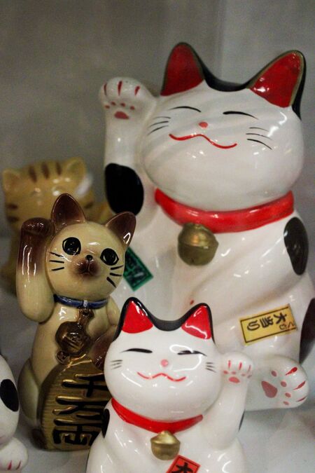 Манэки-нэко — статуэтка в виде кошки, которая приносит удачу, завлекая ее своей поднятой лапкой. Точное происхождение этого талисмана до сих пор неизвестно, но одно из самых ранних упоминаний о фигурке встречается на гравюре Утагавы Хиросигэ в стиле укиё-э ниже. Хотя считается, что Манэки-нэко появились намного раньше.