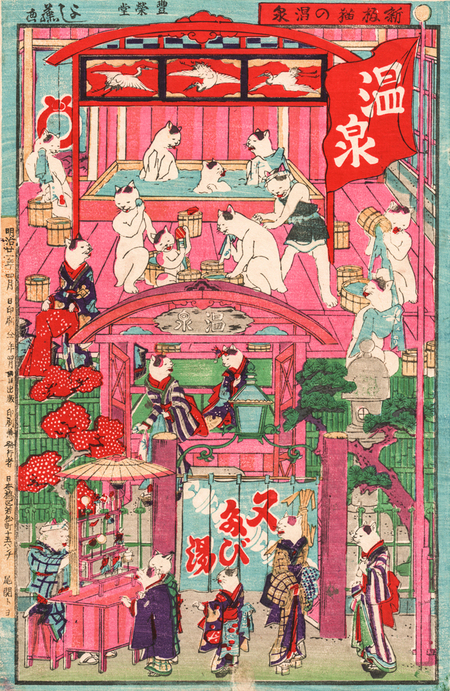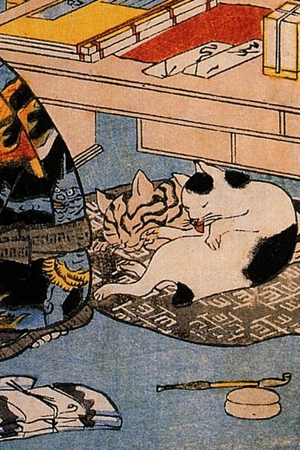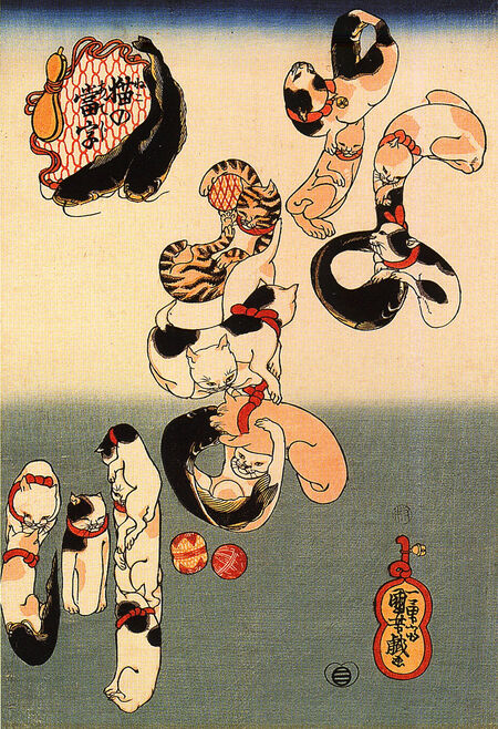 Многие изображения из «кошачий серии» Утагава Куниёси создал из-за закона 1842 года, по которому гравюристам запрещалось изображать театральные сцены, актёров, гейш и куртизанок. На многих его картинах и гравюрах изображены сюжеты с людьми, но в виде кошек.