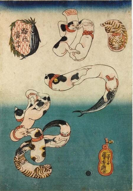 Четыре кошки в разных позах, Утагава Куниёси, 1861 / Маленькие кошки собираются вместе, чтобы стать большой кошкой, Утагава Ёсифудзи, около 1847–1848