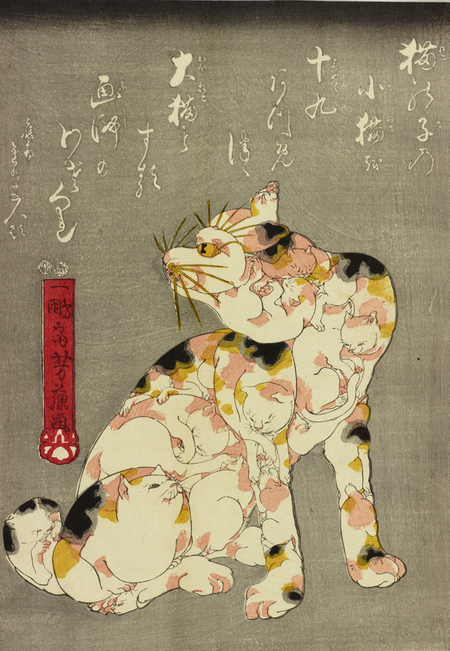 Утагава Куниёси (1 января 1798 — 14 апреля 1861) был одним из последних великих мастеров японского стиля укиё-э гравюры и живописи на дереве. Темы работ Куниёси были очень разнообразны: пейзажи, женщины, актёры театра кабуки, кошки и мифические животные. Сохранилось большое количество его работ, в том числе очень много изображений котов. И как милых домашних питомцев (например, он изобразил их на своем автопортрете ниже), и как кайбё.