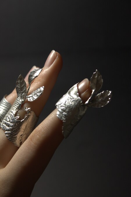 В этих кольцах человек и природа встречаются в одной форме. Отпечатки пальцев становятся продолжением органических линий листа, стирая границу между внутренним и внешним.