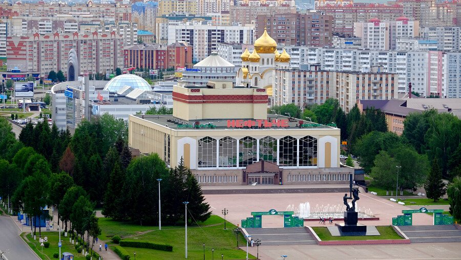 Площадь Нефтяников организована вокруг Памятника нефтяникам-первопроходцам, установленного в 1984 г., и Дворца культуры «Нефтьче». Здесь в материальной форме закрепляется то, что Ассман называет «коллективной памятью»: в памяти жителей производство превращается в героическое действие, а рабочие в героев, тогда как Дворец культуры «Нефтьче» становится символическим местом, где индустриальное наследие становится культурным достоянием.​