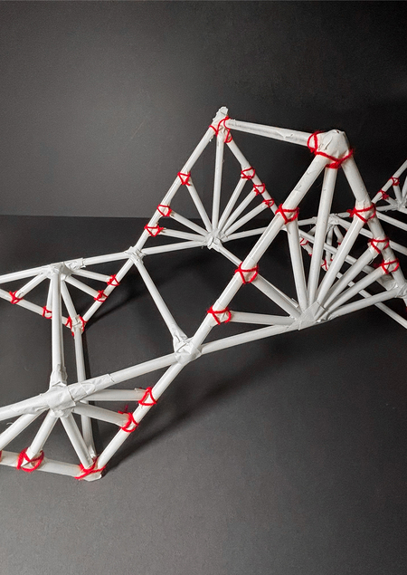 Мой макет представляет собой упрощённую модель ферменного моста, выполненную из трубочек. Я выбрала белый цвет, чтобы подчеркнуть лёгкость и геометрию конструкции, красные нитки имеют не только декоративную функцию, но и эффективную: они «спаивают» швы конструкции