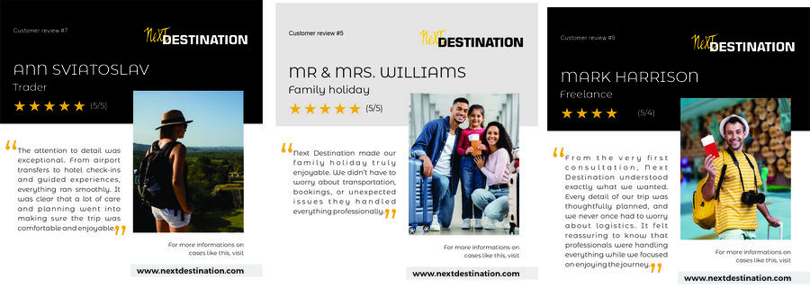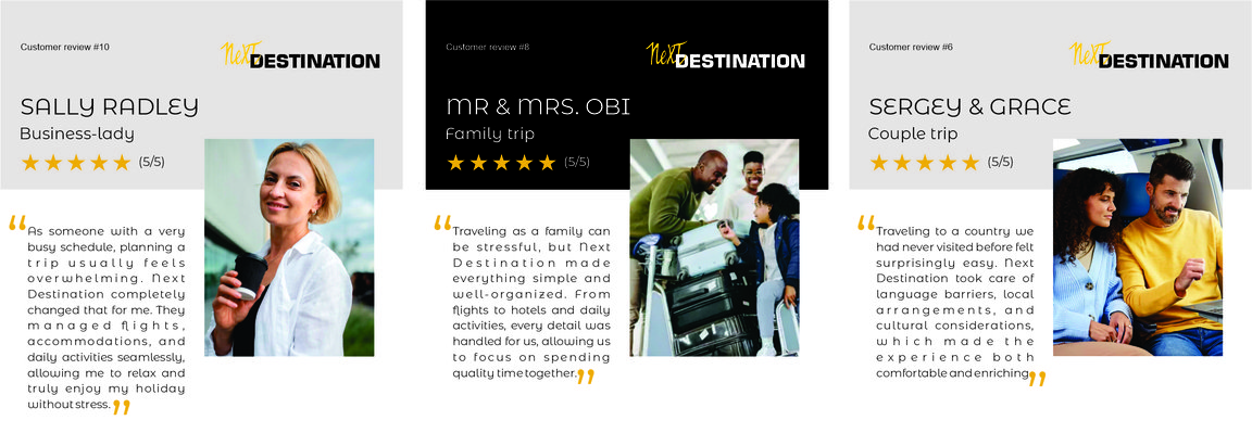 Next Destination is a full-service travel agency created to assist time-pressed people who need purposeful, well-planned travel experiences without the stress and time commitment that come with trip preparation. The company offers complete travel solutions, managing everything from booking flights and lodging to creating carefully planned itineraries and local experiences, all of which are customized to the traveler’s tastes, financial constraints, and timetable.