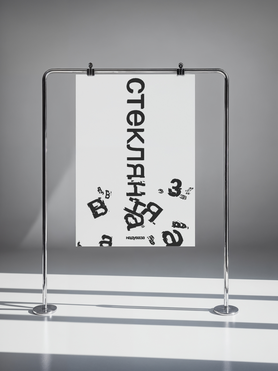 Серия исследует хрупкость обычных стеклянных ваз через типографический язык. Собственный генератор «разбития» шрифта дробит буквы, как бьётся стекло: знаки трескаются, осыпаются, расползаются по листу, превращаясь в осколки текста.