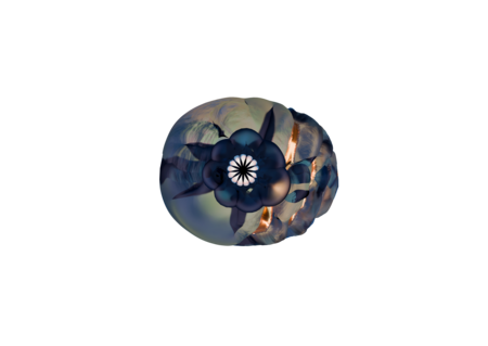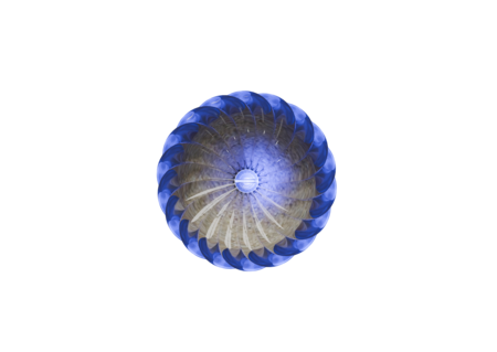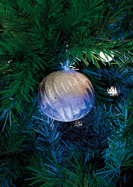 Елочная игрушка выполнена из стекла, рельеф напоминает узор на песке, который образуется от ветра, изнутри игрушка наполнена песком, а сверху и снизу подсвечена синим цветом, отсылающим на «Воду Жизни».