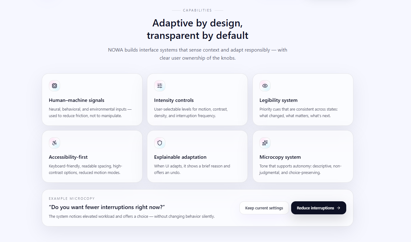 System Logic NOWA operates through: • contextual sensing, • behavioral interpretation, • interface adaptation, • user feedback. All adaptations are explainable and reversible.