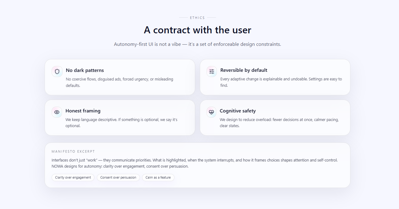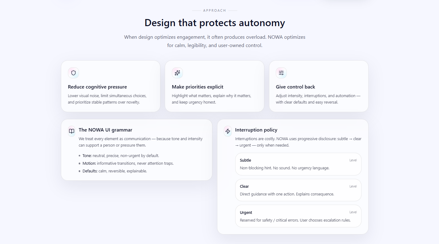 Ethical Framework NOWA rejects: • urgency by default, • shame-based language, • pressure metrics such as time-on-screen. • The system prioritizes autonomy and consent.