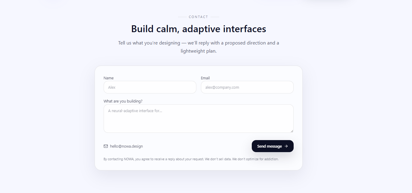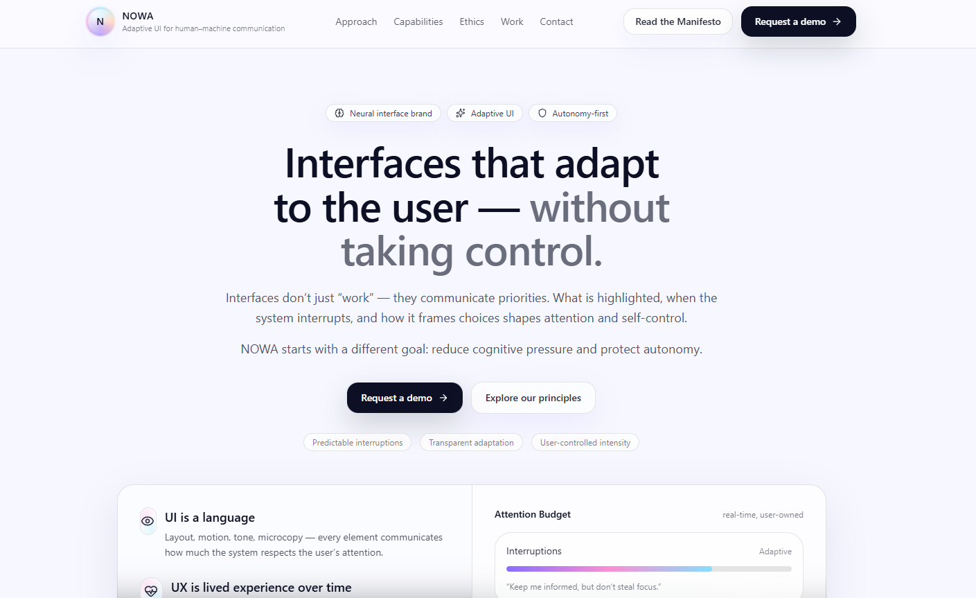 Market Position NOWA positions itself as an alternative to engagement-driven interface design. Its unique value lies in ethical adaptation and communicative transparency.