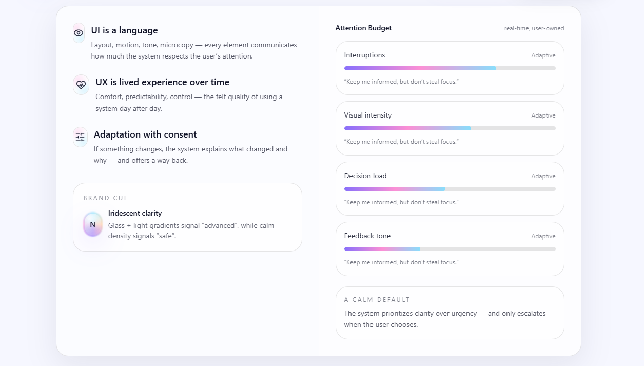 The visual language avoids aggressive contrast, excessive motion, and overstimulation.