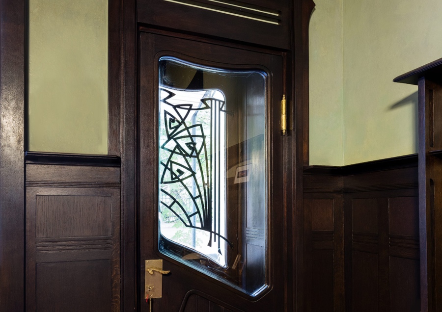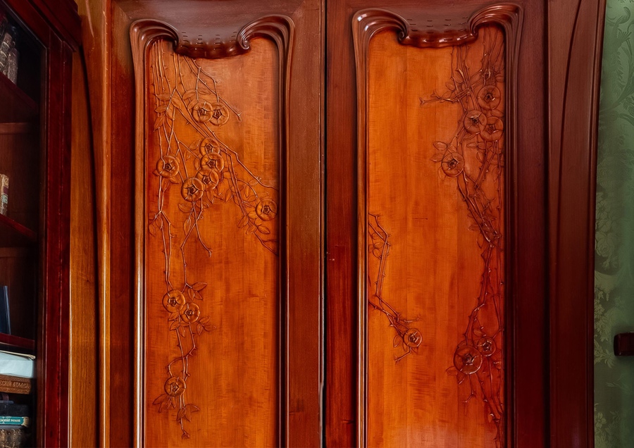 На двери видно узор из гнутых линий, сложенных в биоморфную форму. Думаю, что это мотив флоры, стилизованные побеги, возможно намек на лилии или ирис, характерный мотив модерна.