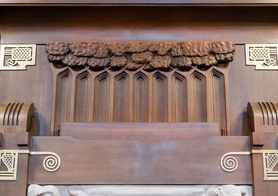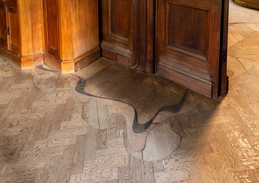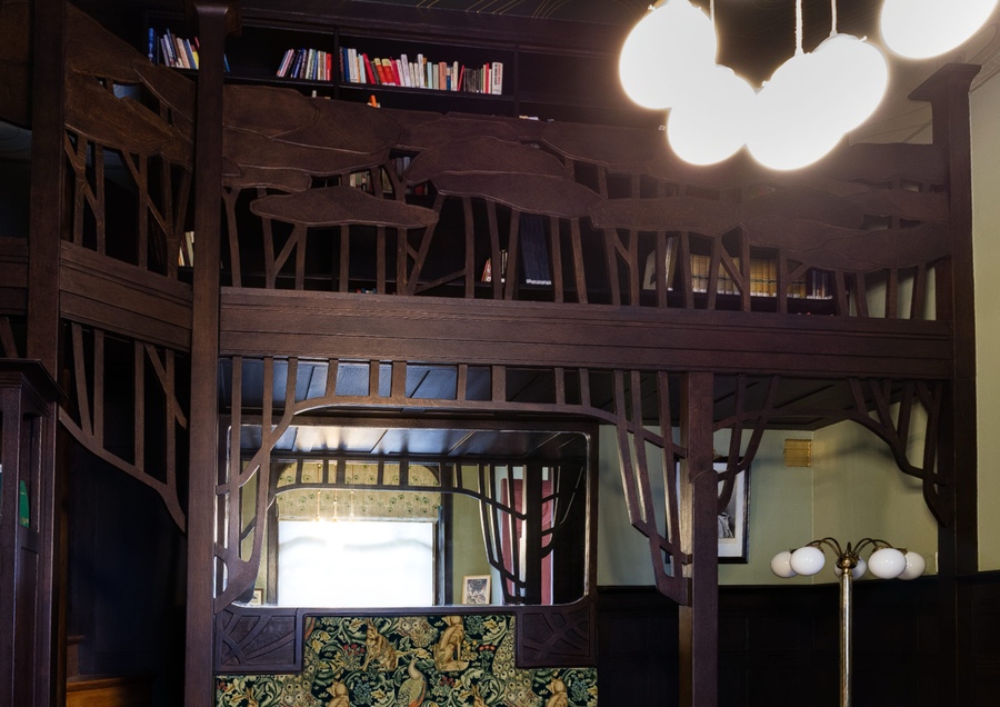 В малой гостиной, на дверных панелях можно заметить резные розы, стилизация, которых похожа на средневековые эмблемы. Розы тут — символ одновременно модерновый и мистический.
