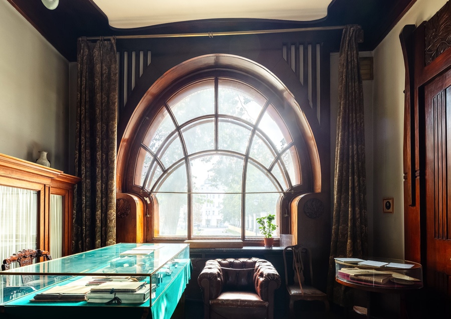 В кабинете можно обнаружить изящный витраж, изображающий Адама. Мы видим его голову, повернутую в профиль, короткую стрижку, ухо, шею, плечо и руку. Адам находится под веткой райского дерева.