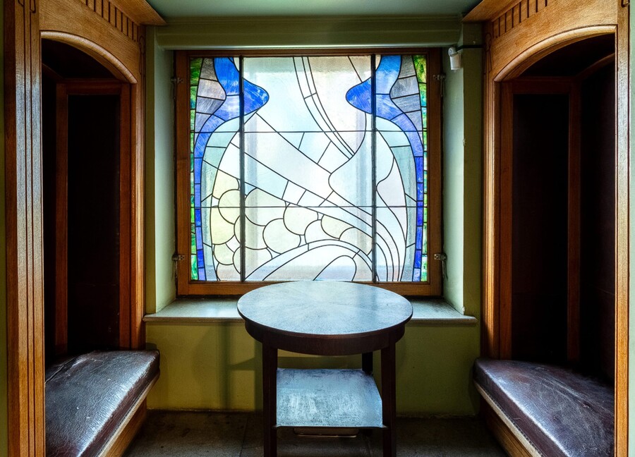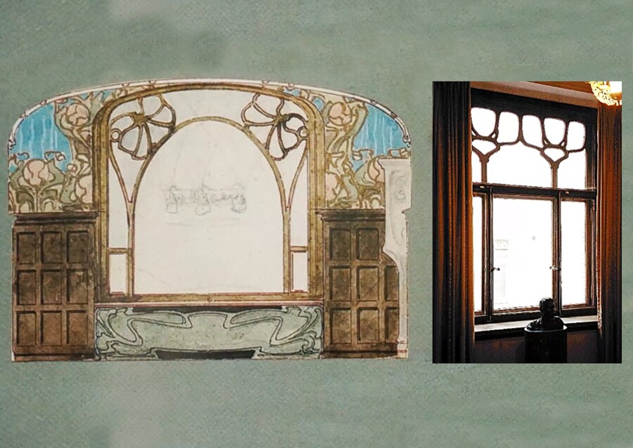 Что интересно, витражей не видно снаружи, то есть они предназначались исключительно для внутреннего пользования, что очень странно, потому что витражи всегда работают на просвет, но это лишь говорит о том, что вся сложная символистская программа особняка, она предназначалась совершенно не для посторонних глаз.
