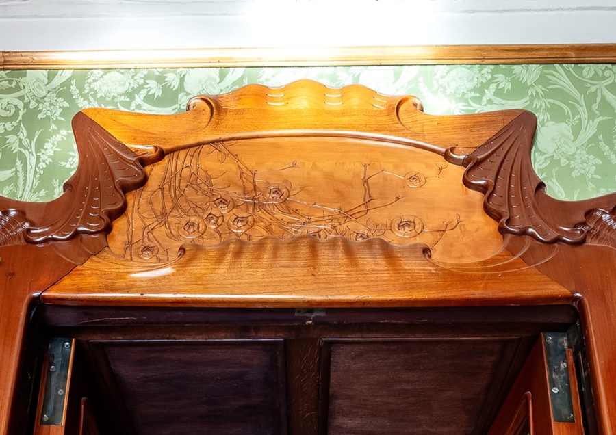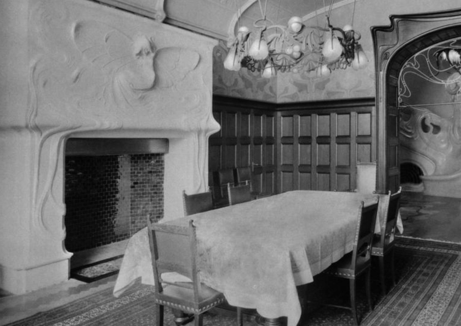 Что же за девушка-бабочка расположилась на камине столовой. Образ этот один из самых устойчивых для модерна. Уходит он к Франции и танцовщице Лои Фуллер, которая создала феномен «танца с крыльями», превращавший тело в гигантскую бабочку или пламенный цветок, что моментально стало визуальной метафорой данной эпохи. Образ с невероятной скоростью распространился во всех видах искусств — от украшений, до театральных костюмов.