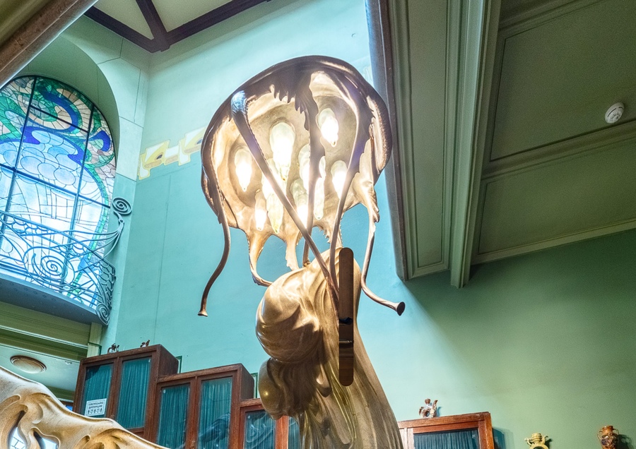 В зале расположено несколько люстр средневекового типа, которые свисают на цепях в несколько уровней. В них же спрятана вентиляционная решетка. Рассматривая подвес, складывается ощущение что это паутинка повисла на ветвях. Паутина в солнечный день после дождя. Это завораживающее зрелище, когда на паутинке остаются капли воды. И в этом смысле модерн был очень близок к природе.