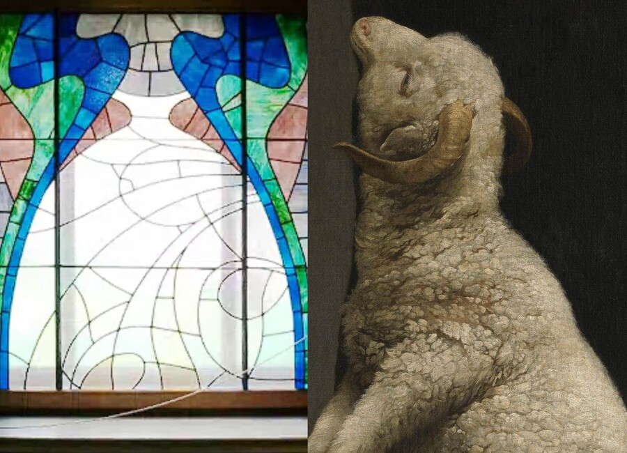 Особняк Рябушинского, витражи лестничного марша/ Франсиско де Сурбаран «Агнец божий» 1640