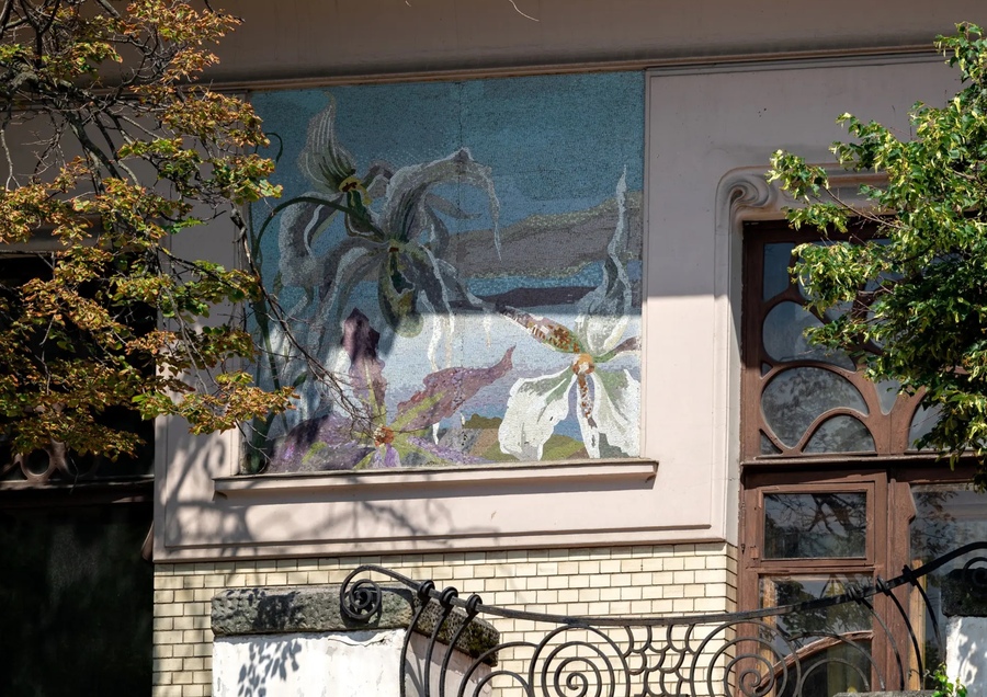 Последнее, что я считаю нужным сделать, это проанализировать некоторые мотивы, использованные в этих особняках. Строительство особняков началось в ранние 1900-е, в годы расцвета модерна, признанного абсолютно интернациональным стилем. В этот период модерн ярко проявлялся на выставках и вызывал всплеск интереса к декоративным формам. У модерна есть три любимых цветочных мотива, два из которых присутствуют в особняке Рябушинского (ирисы и хризантемы) и один в особняке Дерожинской (лилии). Прежде всего, это ирисы, очень любимый цветок Шехтелем. Он оформляет тимпан парадного входа, своего дом данным образом. Ирисы выступающие из золотых фонов — невероятно красивая декоративная композиция, популярная также в Японии.