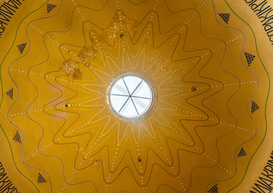Что касается алтарной зоны, от нее расходятся веером линии солнечного света, некогда исходившие от потолка, которые распространяются по всему интерьеру и завершаются куполом.