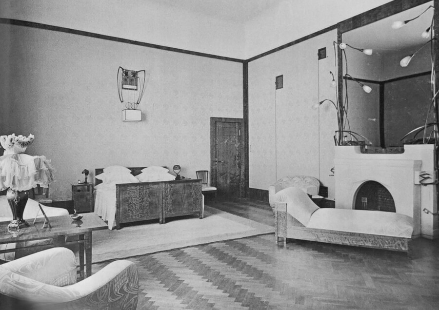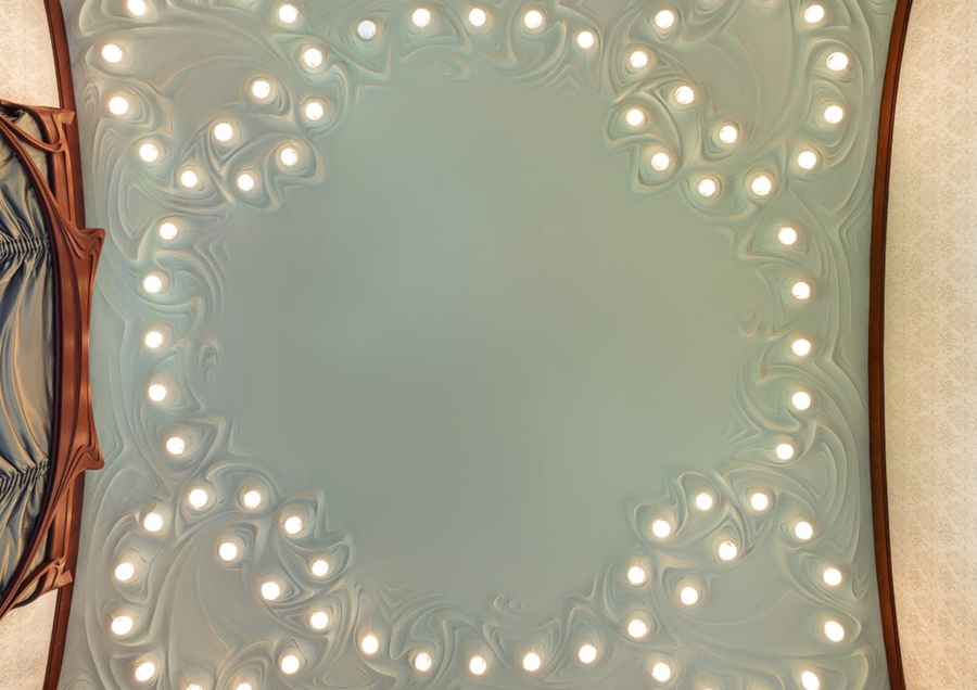 В спальне можно заметить светильники в форме полу распустившихся бутонов. Зафиксировано пограничное положение цветка, когда цветы на ночь опускаются, а утром поднимаются. И вот такое промежуточное состояние, было характерно для культуры модели и, в принципе, и для духовного состояния человека. Состояние сна, бессознательности. Это пример красивого визуального эффекта, вне сложных символических тенденций.