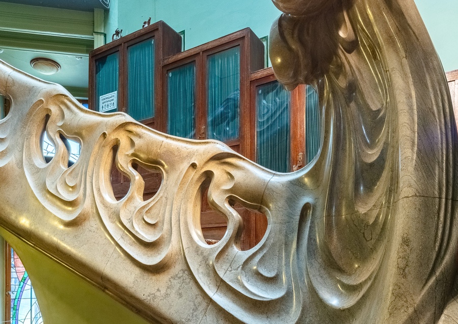 Это лестница шедевр интернационального декоративного модерна, какой необыкновенный изгиб даёт лестничный марш. Относительно данной лестницы часто применяют термин, динамика пустоты, поскольку модерна не терпит пустоты и любая пустота имеет тенденцию к заполнению. Складывается такое впечатление, что волны скоро сомкнутся и заполнят вес пустые участки. На лестнице нет швов, она гладкая, совершенно заполированная. В себе она сочетает функции опорного столба, торшера и даже скамейки. Волна медленно вытекает в вентиляционное отверстие у основания.