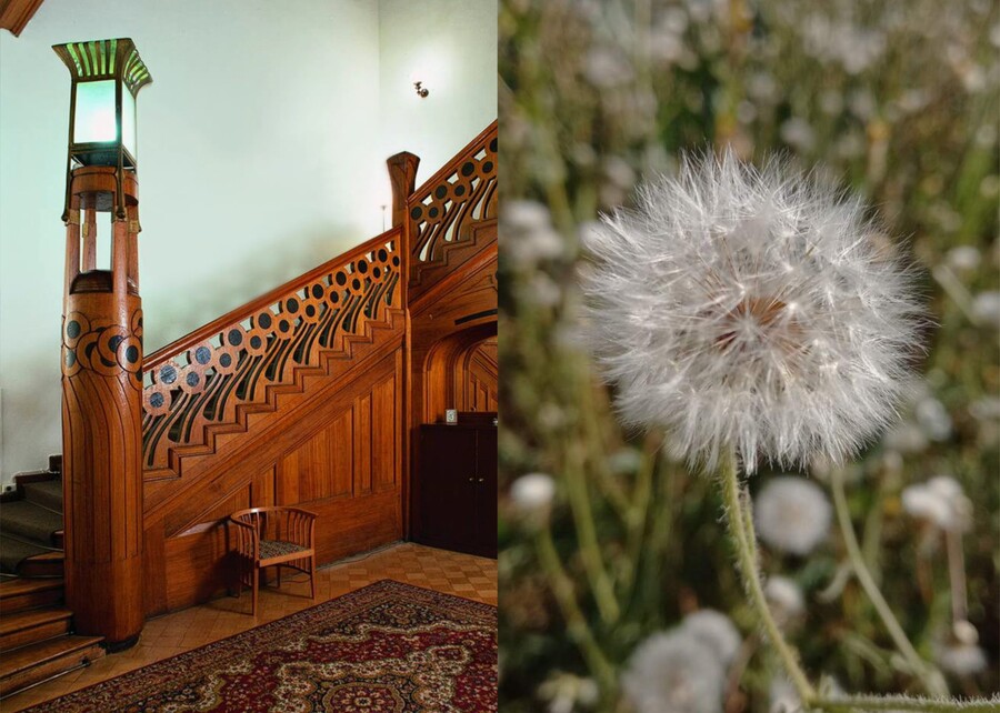 Парадная лестница украшена образом одуванчика. Одуванчик можно расценивать как образ мимолетности, чистоты, хрупкости. У художников модернистов одуванчик часто являлся эмблемой момента колебания между детской непосредственностью и философским началом. Если вспомнить, что парадная лестница видна не каждым вошедшим глазам. То можно выдвинуть теорию о том, что парадная лестница, ведущая к спальне, служит выражением более скрытых и внутренних переживаний хозяйки, в отличии от большого паука, встречающего гостей.