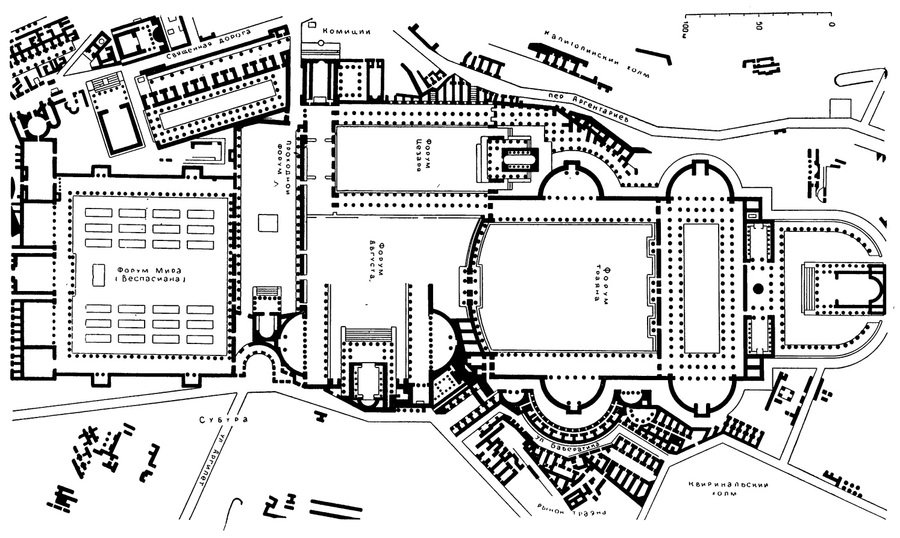 Схемы императорских форумов, расположение и пропорции адаптированы в соответствии с современным планом Рима