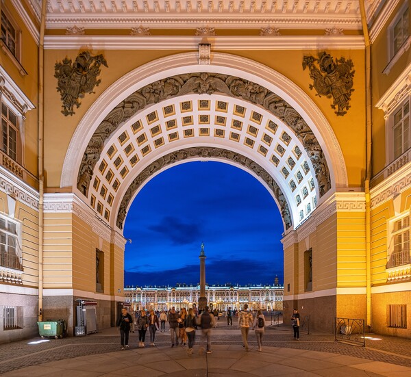 Одним из ключевых элементов преемственности является открытость и проходимость пространства. Агора встраивалась в городскую сетку как естественное продолжение маршрутов, обеспечивая свободное движение. Тот же принцип лежит в основе планировки многих европейских площадей нового времени. Примером может служить Дворцовая площадь в Санкт-Петербурге, где Триумфальная арка Главного штаба действует как современный аналог античных монументальных входов в агору или форум: она формирует композиционную ось, соединяет здания и открывает перспективу на Невский проспект. Её колесница Славы, фигуры Воинов, воинские трофеи соответствуют визуальной риторике римского ампира и его торжественной тональности.