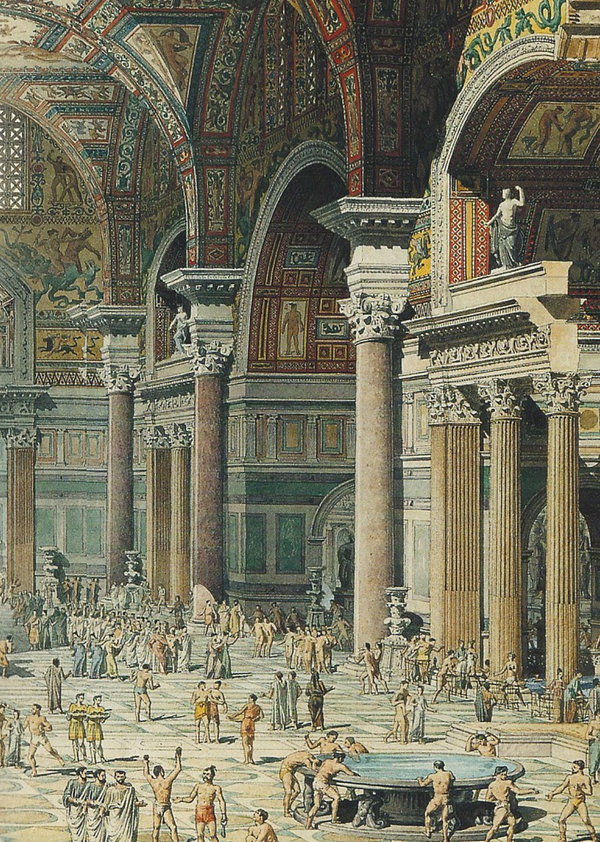 Термы были сложной многофункциональной формой общественного пространства. Помимо банных помещений, в них включались сады, библиотеки, залы для бесед, спортивные площадки.
