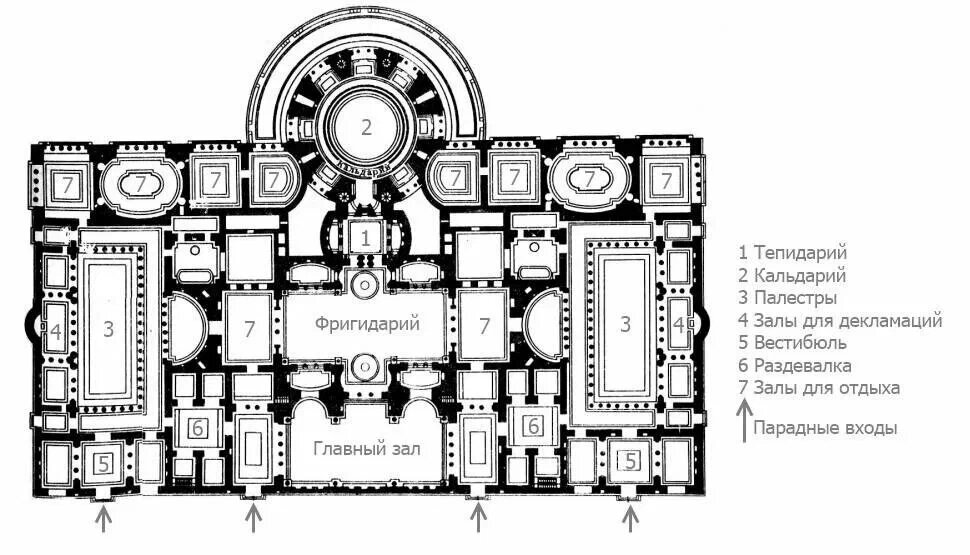 Банные помещения с разными температурными зонами: — Фригидарий (холодный зал с открытым бассейном), — Тепидарий (тёплый зал), — Кальдарий (горячая баня с куполом диаметром 35 метров).