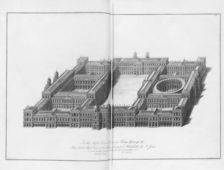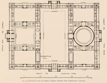 Уайтхолл, незавершенный проект по мотивам палладианства, Иниго Джонс, Лондон (Великобритания), 1530 год, разрушен в 1698 году