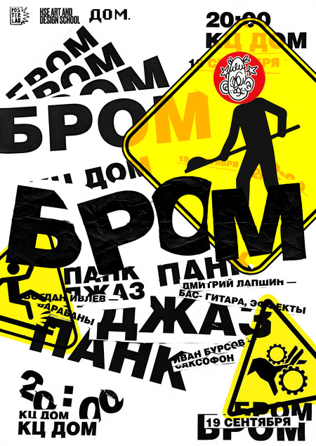 Плакат для джаз-панк группы Бром построен вокруг образа железа — холодного, громкого, индустриального. Его символом стали дорожные знаки, напоминающие о шуме города и ритме панк-звучания. Фигура рабочего на знаке «выкапывает» из земли неровное название группы, превращая шум в форму.