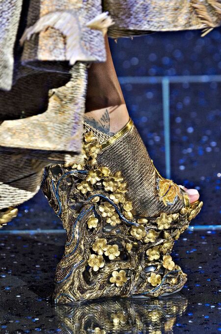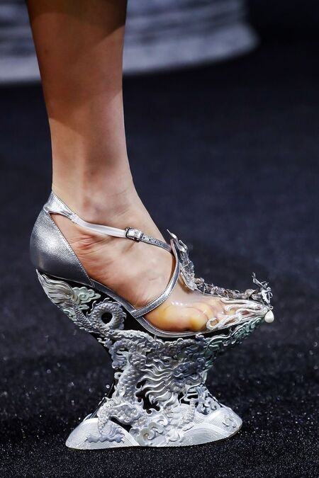Иногда дизайнеры напрямую могли заимствовать форму и визуальный код определенного исторического периода, так Guo Pei в своей кутюрной коллекции 2019 года воссоздал форму чопинов.