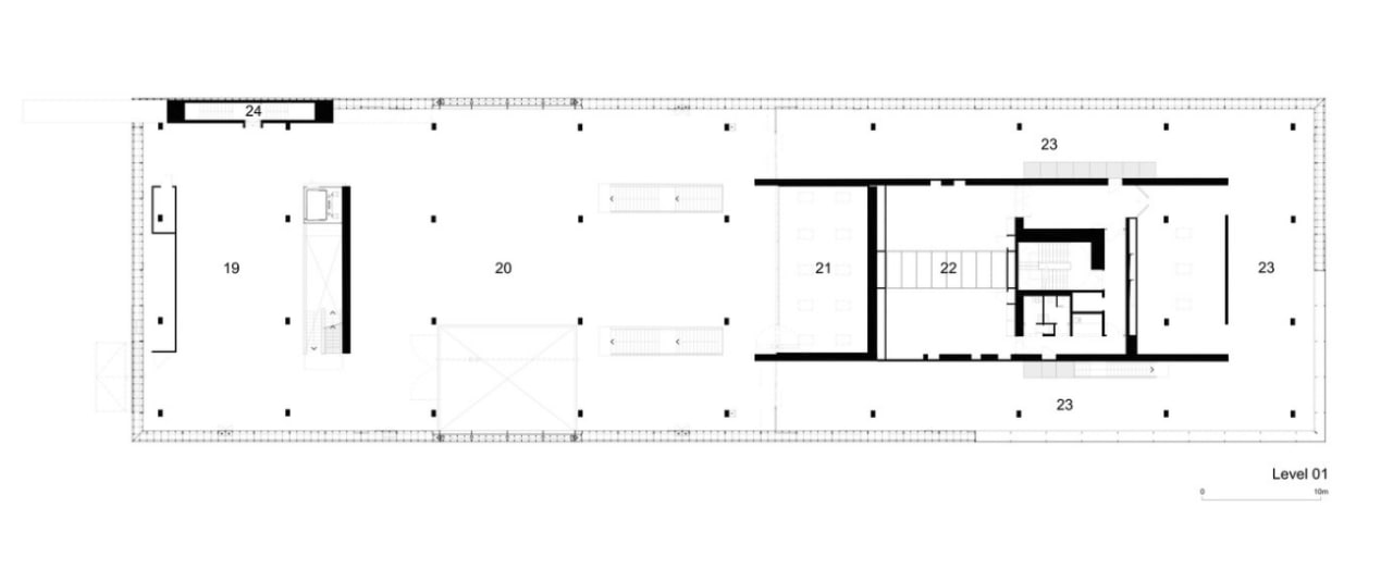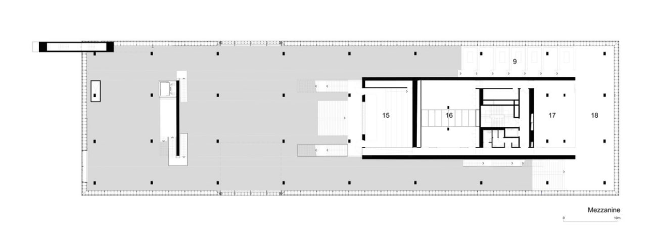Композиционно, здание имеет монолитно параллелепипедную форму, в котором исходное функциональное зонирование представляло собой: