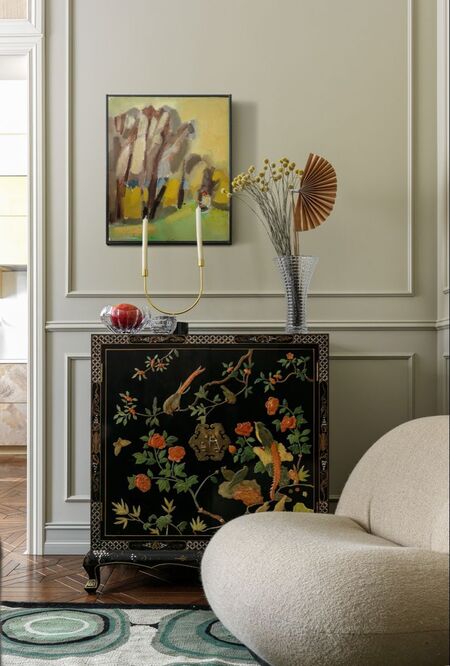 Если не хочется добавлять слишком очевидные детали, можно разбавить интерьер декором, например, лаковой шкатулкой, настенным веером или даже вазой, эти элементы привнесут стиль шинуазри в любой интерьер.