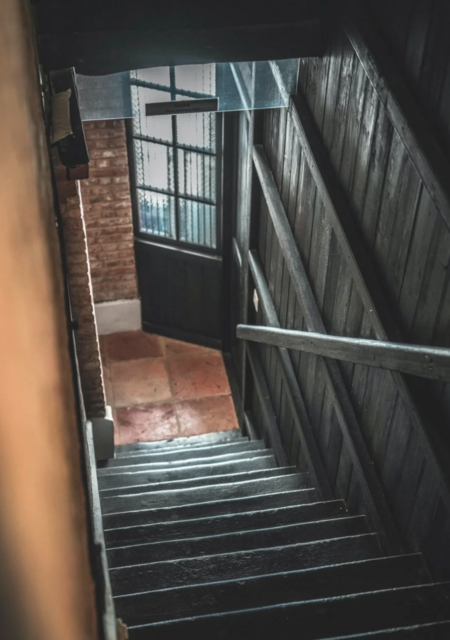Жёсткая структура пространства мгновенно усиливает шаги, делая каждое движение слышимым и ощутимым.