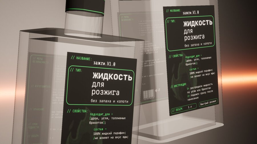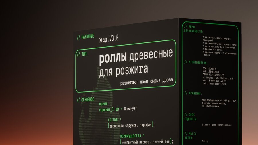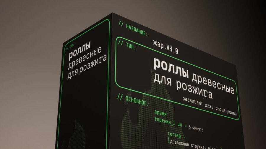 Упаковка товаров для розжига огня «ЗАЖГИ» создана для тех, кто впервые отвечает за костёр и не хочет ошибиться. Всё оформлено как понятный компьютерный код: чёткие шаги, простые команды, ясные обозначения. Вы запускаете процесс розжига так же легко, как скрипт на своём гаджете. Никаких лишних действий — всё работает с первого раза.