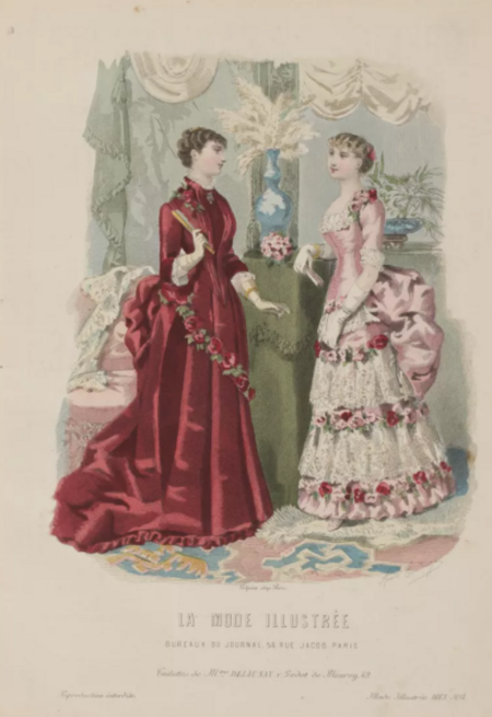 Illustration of models and outfits of the House of Worth by an unknown French artist for «La Mode Illustrée» [Электронный ресурс] // Fashion History. URL: https://fashionhistory.fitnyc.edu/1883-worth-red-dinner-dress (дата обращения: 21.12.2025).