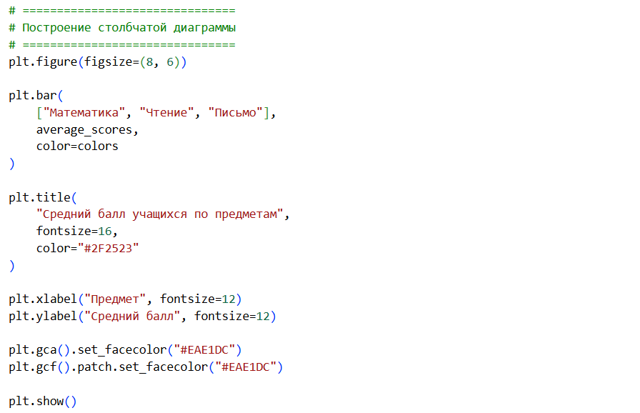 2. Столбчатая диаграмма — для сравнения средних экзаменационных баллов по различным предметам.